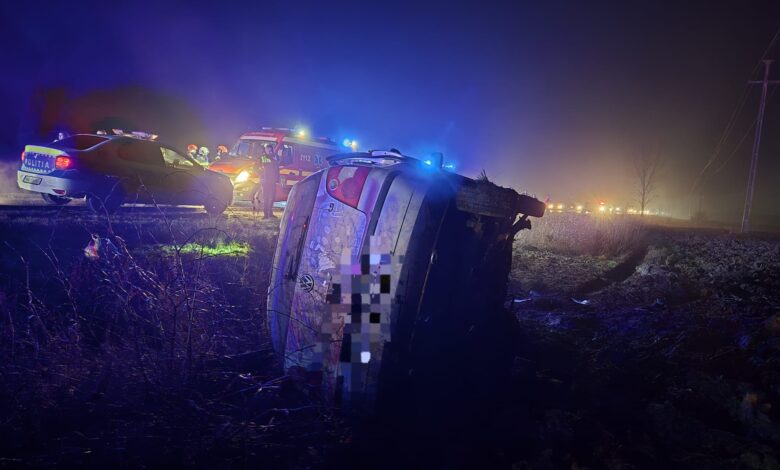 Autoturism răsturnat în șanț, aproape de Satu Mare! Trei adulți și un copilaș de doi ani au ajuns la spital!