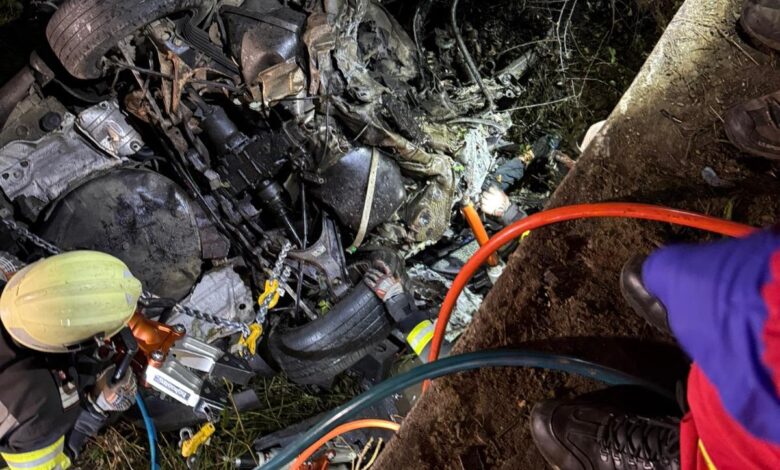 La sosirea forțelor de intervenție, autoturismul a fost găsit răsturnat într-un șanț cu apă, pe plafon, în condiții extrem de dificile pentru acces și intervenție.