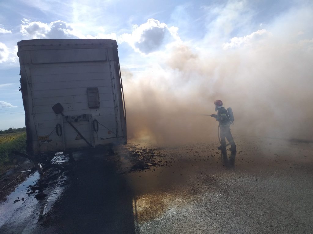 La sosirea echipajelor de intervenție ale pompierilor la locul evenimentului, acestea au acționat pentru limitarea și lichidarea incendiului care se manifesta cu degajări mari de fum și ardere generalizată la întreaga încărcătură lemnoasă (material lemnos pentru mobilă) de pe semiremorca implicată în incident.