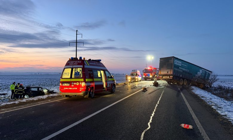 În accident a fost implicat un autocamion și un autoturism, care s-a răsturnat în afara părții carosabile.