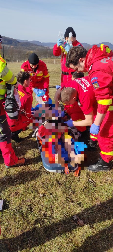 Misiune de salvare a unui bărbat accidentat de un tractor care s-a răsturnat peste el în comuna Batarci, zonă forestieră.