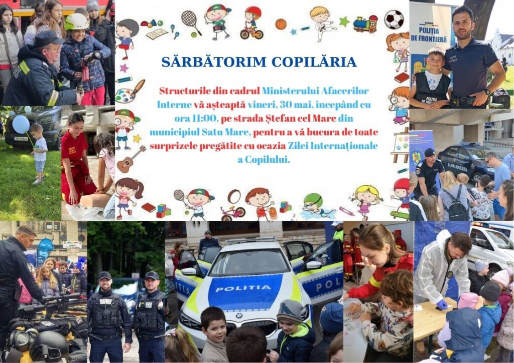 Sunteți invitați cu mic, cu mare, vineri, 30 mai a.c., începând cu ora 11.00, pe strada Ștefan cel Mare din municipiul Satu Mare, să intrați în lumea plină de aventură și neprevăzut a polițiștilor, polițiștilor de frontieră, jandarmilor și pompierilor sătmăreni.
