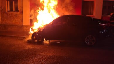 Autoturism în flăcări, în miez de noapte, aflat parcat pe o stradă din Satu Mare