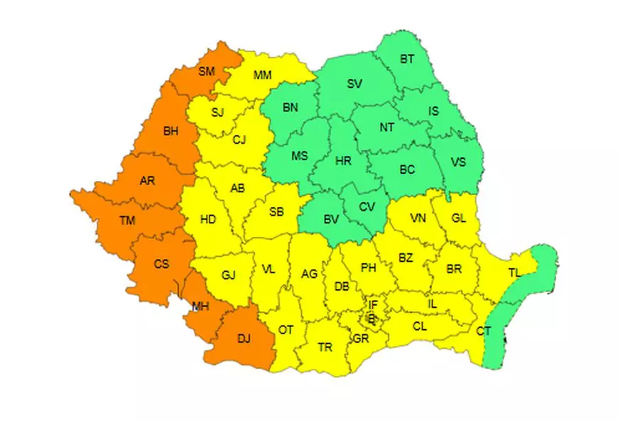 Un cod portocaliu de caniculă și disconfort termic accentuat a fost emis și pentru perioada 10 august, ora 10:00 și 11 august, ora 10:00, în județele Satu Mare, Bihor, Arad, Timiș, Caraș-Severin, Mehedinți și Dolj.