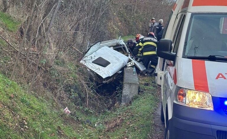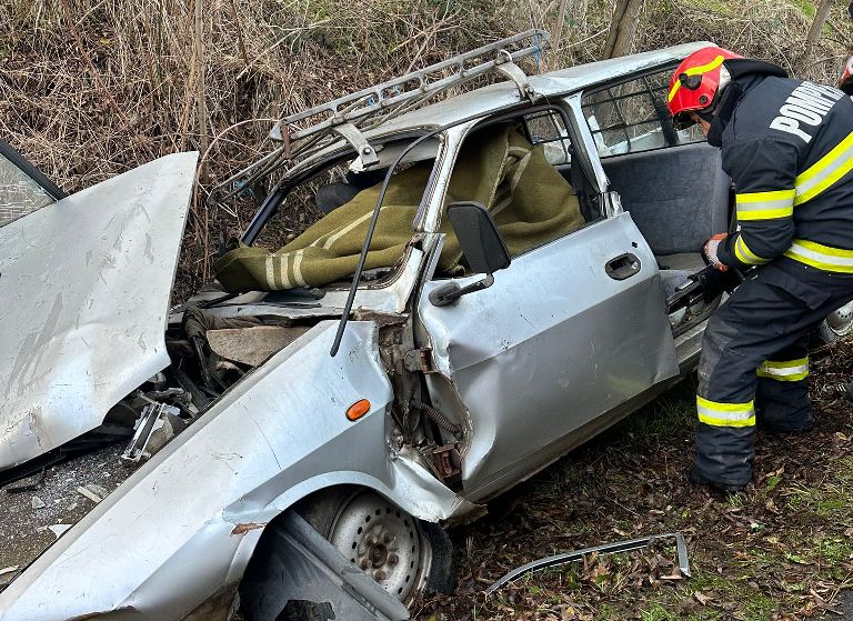 Șofer de 75 de ani, rămas încarcerat în mașină după o coliziune cu un cap de pod, în județ!