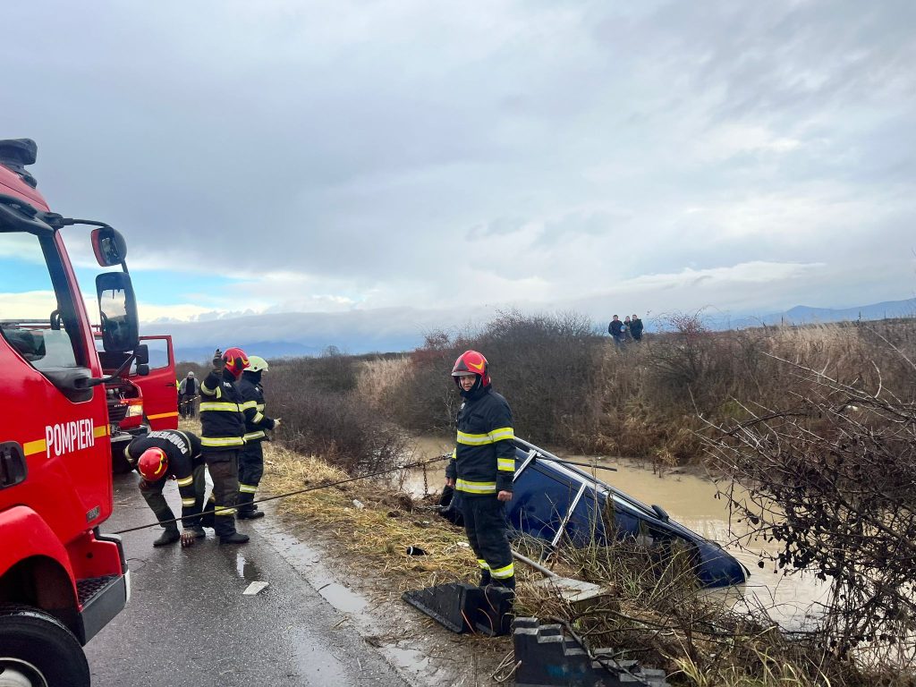 La sosirea pompierilor la fața locului, autoturismul implicat în accident se afla aproape integral sub apă, o singura persoană din cei 4 pasageri, reușind să se autoevacueze.
