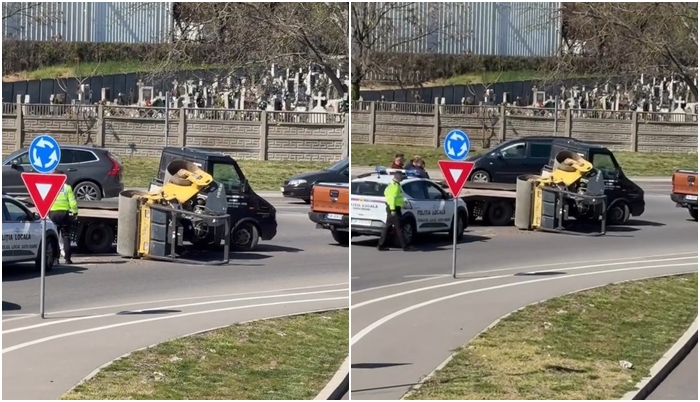 Incidentul, care a blocat parțial circulația, indică o eroare de asigurare a încărcăturii pe platforma de transport. De cele mai multe ori, astfel de evenimente se produc atunci când forța centrifugă exercitată în timpul virajului în sensul giratoriu învinge sistemele de prindere, fie că vorbim despre chingi uzate sau despre o ancorare insuficientă pentru greutatea utilajului.
