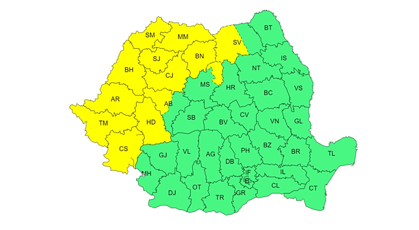 Potrivit ANM, sunt vizate județele Satu Mare, Maramureș, Bistrița-Năsăud, Mureș, Suceava, Cluj, Sălaj, Alba, Bihor, Arad, Hunedoara, Timiș și Caraș-Severin.
