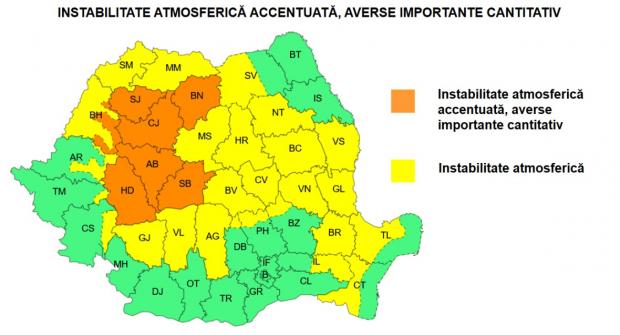 În județele Hunedoara, Alba, Sibiu, Cluj, Sălaj, Bistrița-Năsăud și zona de munte a județului Bihor vor fi averse importante cantitativ, frecvente descărcări electrice, intensificări ale vântului (rafale de 50…70 km/h) și grindină. În intervale scurte de timp sau prin acumulare, cantitățile de apă vor fi de 40…50 l/mp și izolat de peste 60 l/mp.