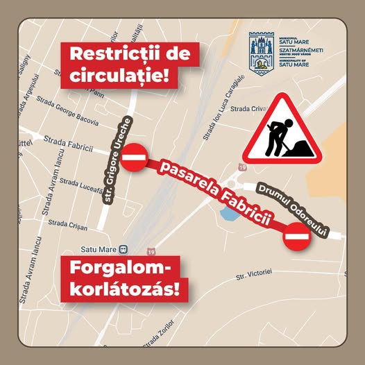 Primăria Satu Mare informează că în perioada 13 – 16 iunie, pasarela Fabricii, de la intersecția cu Drumul Odoreului până la cea cu strada Grigore Ureche, este închisă circulației publice pentru lucrări de reparații la carosabil.