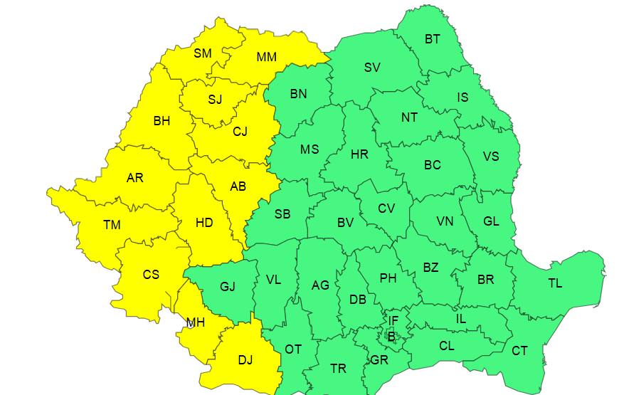 Meteorologii au emis o avertizare cod galben de caniculă valabilă pentru ziua de miercuri în mai multe județe din Maramureş, Crişana, Banat, vestul Transilvaniei şi sud-vestul Olteniei.
