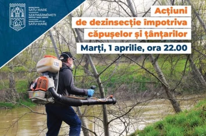 Primăria Municipiului Satu Mare anunță că marți, 1 aprilie, după ora 22.00, are loc o acțiune de dezinsecție împotriva căpușelor și a țânțarilor.