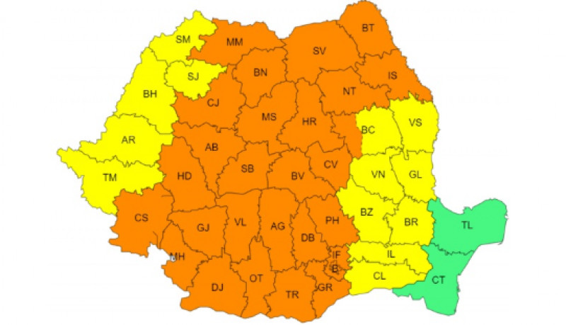 Judeţele din restul ţării (cu excepţia judeţelor Constanţa şi Tulcea) se vor afla sub avertizare Cod galben de instabilitate atmosferică în acelaşi interval de timp. În Crişana, nord-vestul Transilvaniei şi local în Banat, Maramureş, Muntenia şi Moldova, vor fi averse torenţiale, intensificări ale vântului (rafale în general de 50…70 km/h), vijelii, grindină şi descărcări electrice. În intervale scurte de timp sau prin acumulare cantităţile de apă vor fi de 20…30 l/mp şi izolat de peste 40 l/mp.