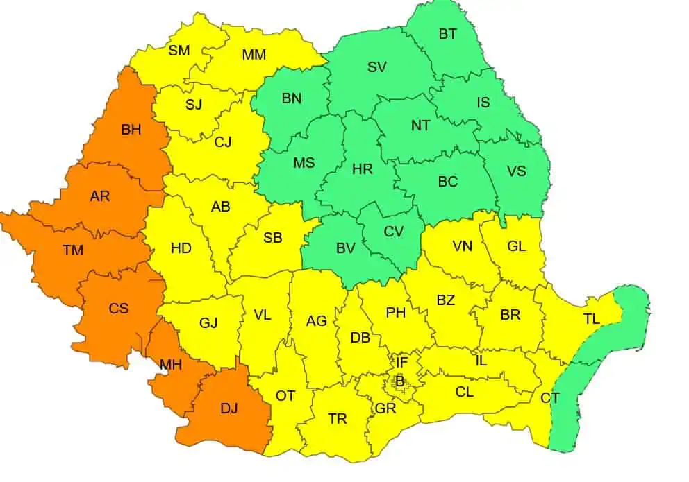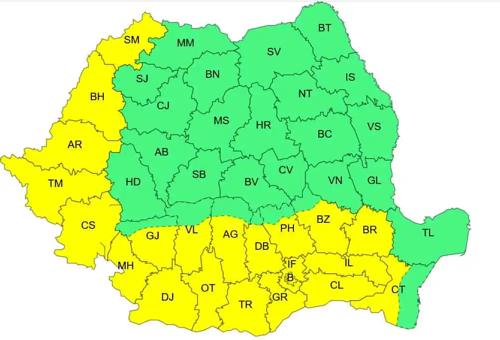 Administraţia Naţională de Meteorologie a emis o atenţionare Cod galben de caniculă şi disconfort termic ridicat, noapte tropicală, valabilă de sâmbătă, de la ora 12.00, până duminică, la ora 10.00, în judeţele Satu Mare, Bihor, Arad, Timiş, Caraş-Severin, Mehedinţi, Dolj, Olt, Teleorman, Giurgiu, Ilfov, Călăraşi, Ialomiţa, Brăila, în municipiul Bucureşti şi în cea mai mare parte a judeţelor Constanţa, Buzău, Prahova, Dâmboviţa, Argeş, Vâlcea şi Gorj.