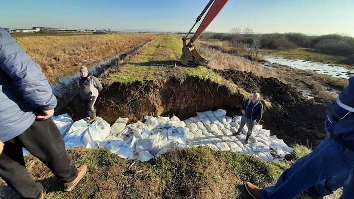 Angajații Sistemului de Gospodărire a Apelor (SGA) Satu Mare intervin pentru închiderea unei breșe, produse în corpul digului de pe Valea Maria, în zona localității Giungi, comuna Beltiug.