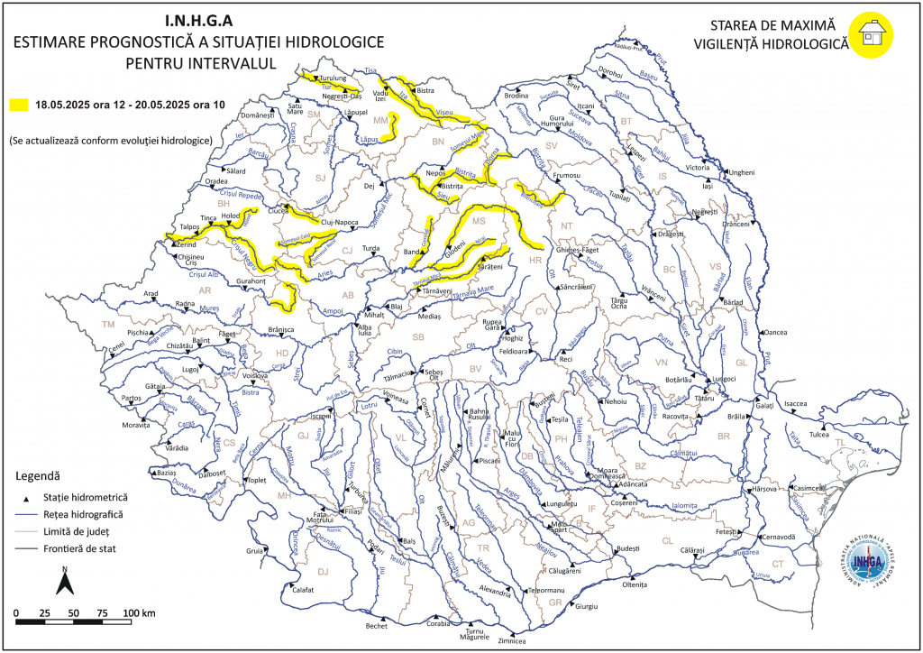 În intervalul 18.05.2025 ora 12:00 – 20.05.2025 ora 10:00 pe râurile din bazinele hidrografice: râul Tisa – pe sectorul aferent S.H. Valea Vişeului (intrarea în ţară), Vişeu, Iza, Lăpuş – bazin superior şi afluenţi bazin mijlociu şi inferior (judeţul Maramureş), Tur (judeţul Satu Mare), Someşul Mare – bazin superior și afluenţi bazin mijlociu și inferior (judeţul Bistriţa Năsăud), Someşul Mic – bazin superior și afluenţi bazin mijlociu și inferior (judeţele: Bihor şi Cluj), Crişul Repede – bazin superior și afluenţi bazin mijlociu și inferior (judeţele: Cluj şi Bihor), Crişul Negru (judeţele: Bihor şi Arad), Crişul Alb – bazin amonte S.H. Vaţa de Jos şi afluenţii aferenţi sectorului aval S.H Vaţa de Jos (judeţele: Hunedoara şi Arad), Mureş – bazin amonte S.H. Glodeni şi afluenţii aferenţi sectorului aval S.H. Glodeni – amonte confluenţă cu râul Arieş (judeţele: Harghita, Mureş şi Bistriţa Năsăud), Arieş – bazin superior şi afluenţi bazin mijlociu şi inferior (judeţele: Alba şi Cluj), Târnava Mică – bazin amonte S.H. Târnăveni (judeţele: Harghita şi Mureş), Bistriţa (afluent al Siretului) – bazin amonte S.H. Cârlibaba şi afluenţii aferenţi sectorului aval S.H. Cârlibaba – amonte Ac. Izvoru Muntelui (judeţele: Suceava, Neamţ şi Harghita).