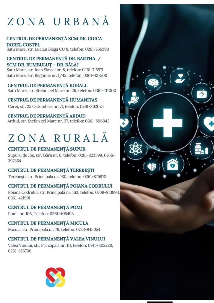 Pentru situațiile în care aveți nevoie de asistență medicală în weekend, când cabinetele medicilor de familie sunt închise, vă puteți adresa centrelor de permanență. Acestea funcționează în regim de gardă și oferă consultații pentru probleme medicale care nu reprezintă urgențe majore.