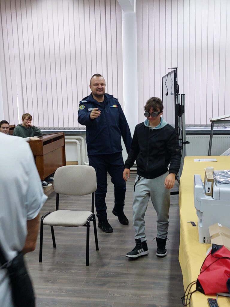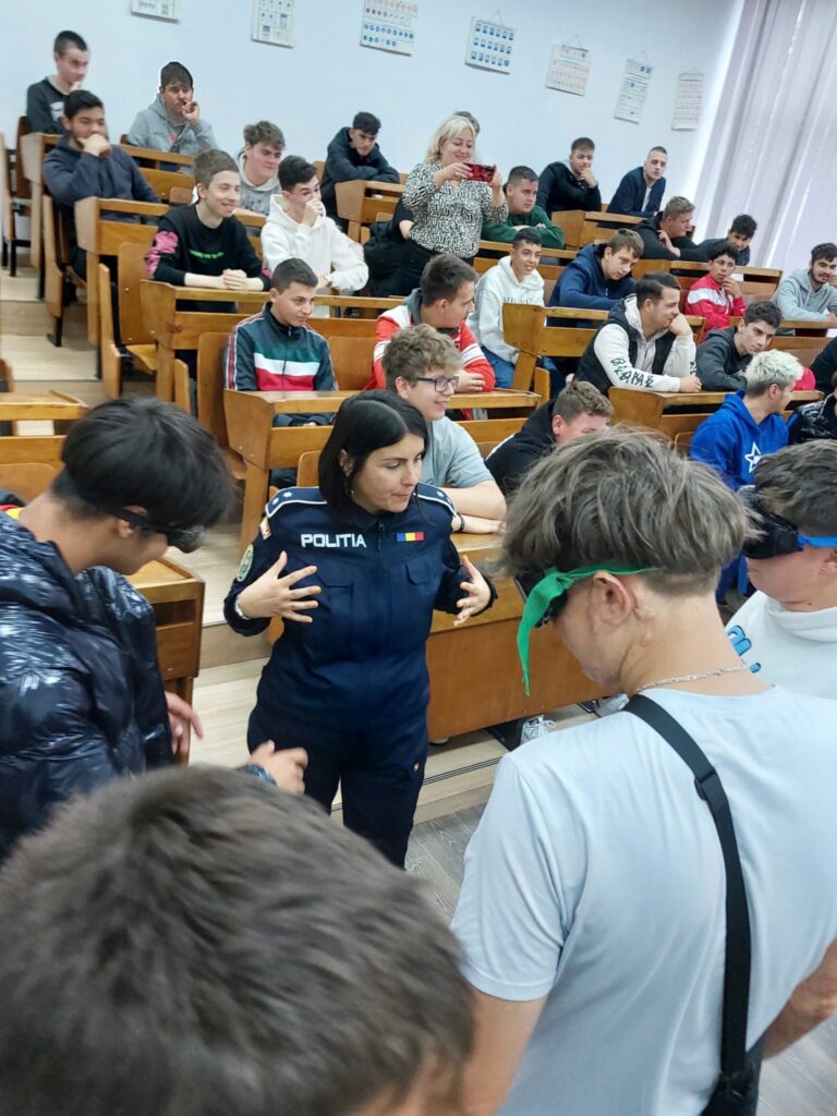 Unul dintre momentele cele mai apreciate a fost demonstrația cu ajutorul ochelarilor speciali care simulează efectele consumului de alcool și droguri. Elevii au avut ocazia să experimenteze „realitatea distorsionată” pe care o trăiește o persoană aflată sub influența acestor substanțe, încercând să parcurgă trasee simple sau să îndeplinească sarcini ușoare — exerciții care s-au dovedit mult mai dificile decât păreau la prima vedere.