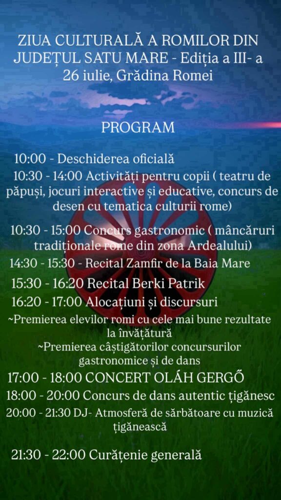 Sâmbătă, 26 iulie, parcul „Grădina Romei” din municipiul Satu Mare va găzdui cea de-a III-a ediție a Zilei Culturale a Romilor din județul Satu Mare, un eveniment dedicat promovării tradițiilor și culturii rome.