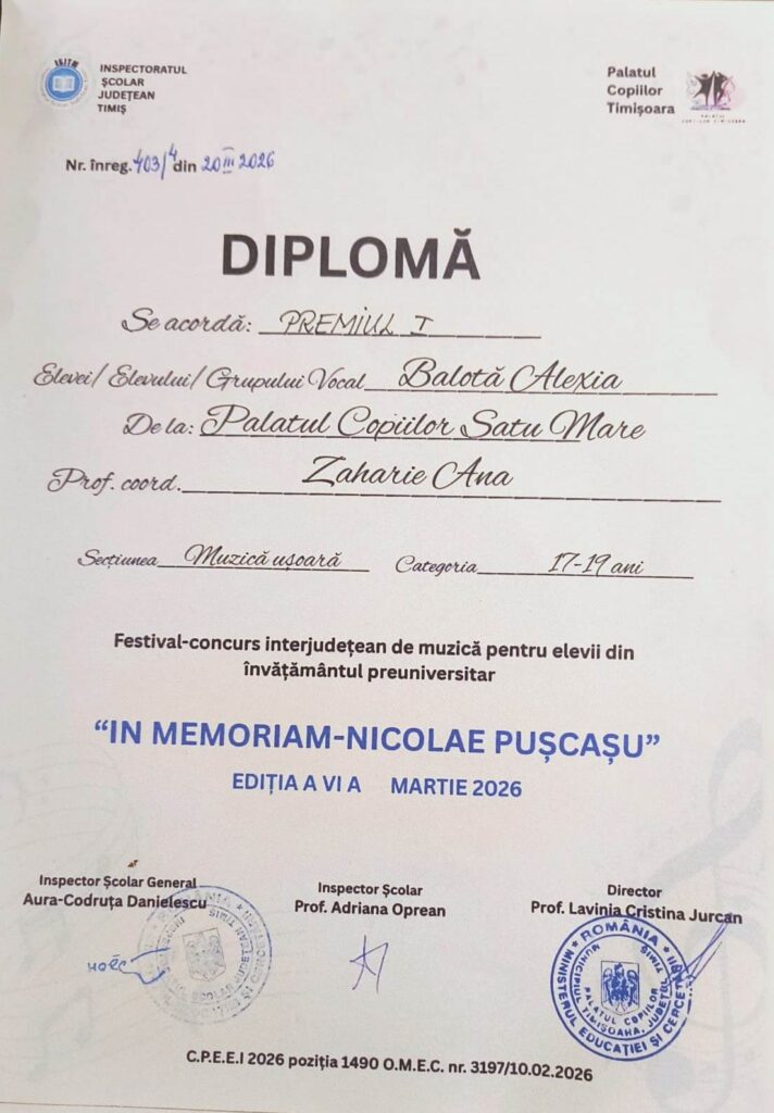 Performanțele nu s-au oprit aici. Alexia Balota a urcat pe prima treaptă a podiumului la secțiunea solist, confirmând încă o dată valoarea artistică a tinerelor din Satu Mare. De asemenea, duetul format din Alexia Balota și Benzar Rebeca a fost recompensat cu locul I, iar Benzar Rebeca a obținut și un loc III la secțiunea solist.