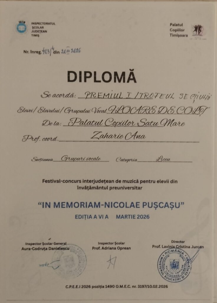 Tinerele artiste, coordonate de profesoara Ana Zaharie, au participat în perioada 27–28 martie la Concursul național de muzică ușoară, folclor și folk „In Memoriam Nicolae Pușcașu”, unde au reușit să impresioneze atât juriul, cât și publicul prin sensibilitatea interpretării și calitatea actului artistic.