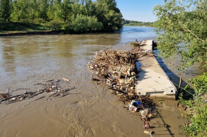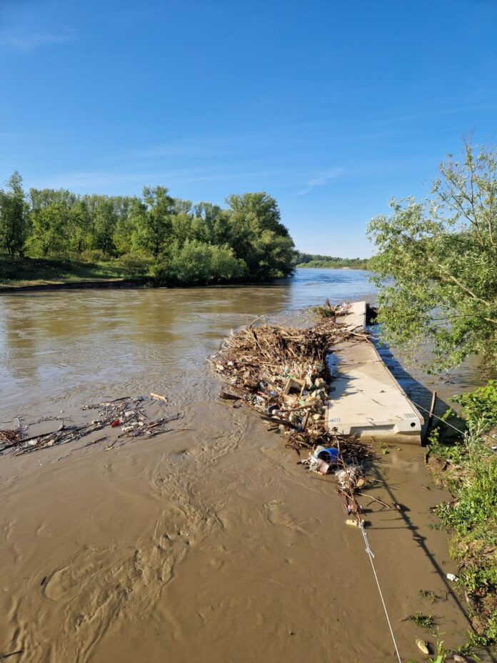Sistemul de colectare a deșeurilor plutitoare de pe râul Someș, avariat! Deșeurile plutitoare reținute în secțiune, au luat-o la vale, spre Ungaria!