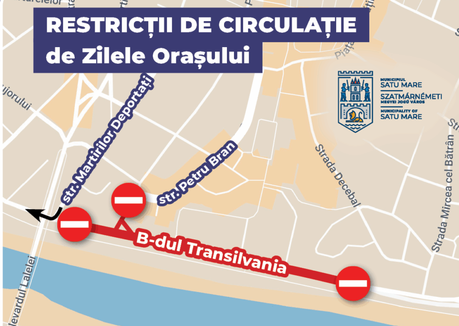 Pentru buna desfășurare a Zilelor Orașului Satu Mare, eveniment care are loc în 30 mai -1 iunie, se anunță restricții de circulație începând de joi, 29 mai, ora 17.00, și până luni, 2 iunie, ora 07.00, pe Bulevardul Transilvania, conform hărții atașate.
