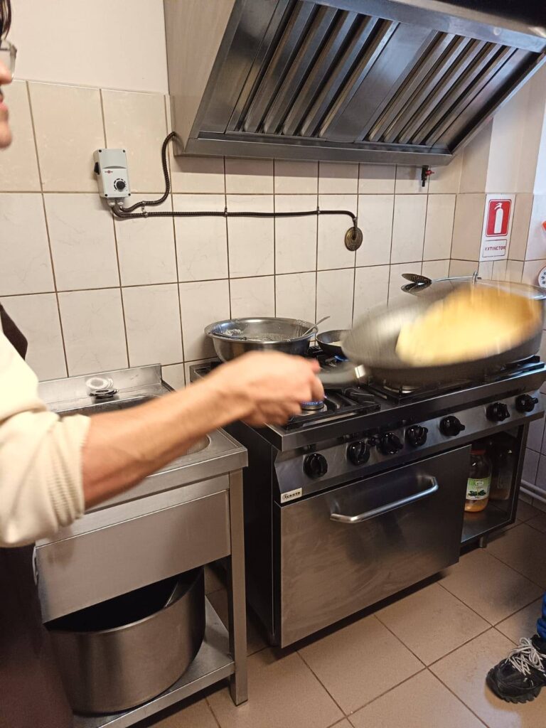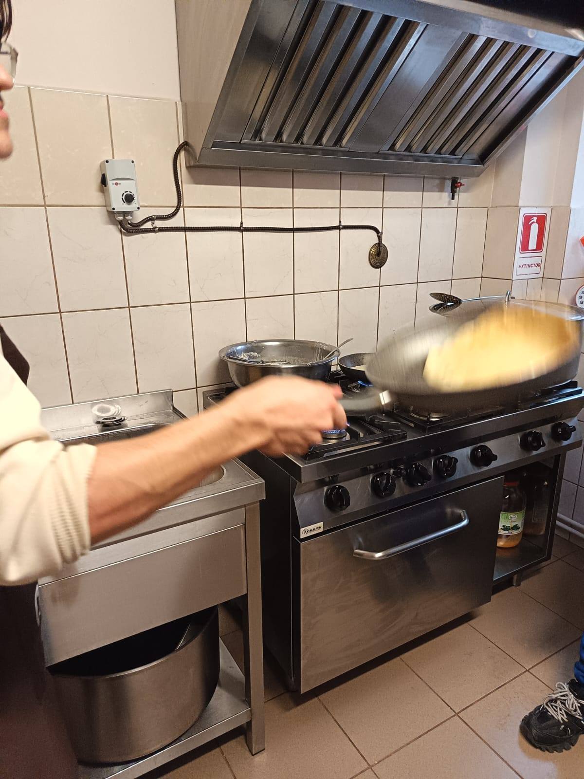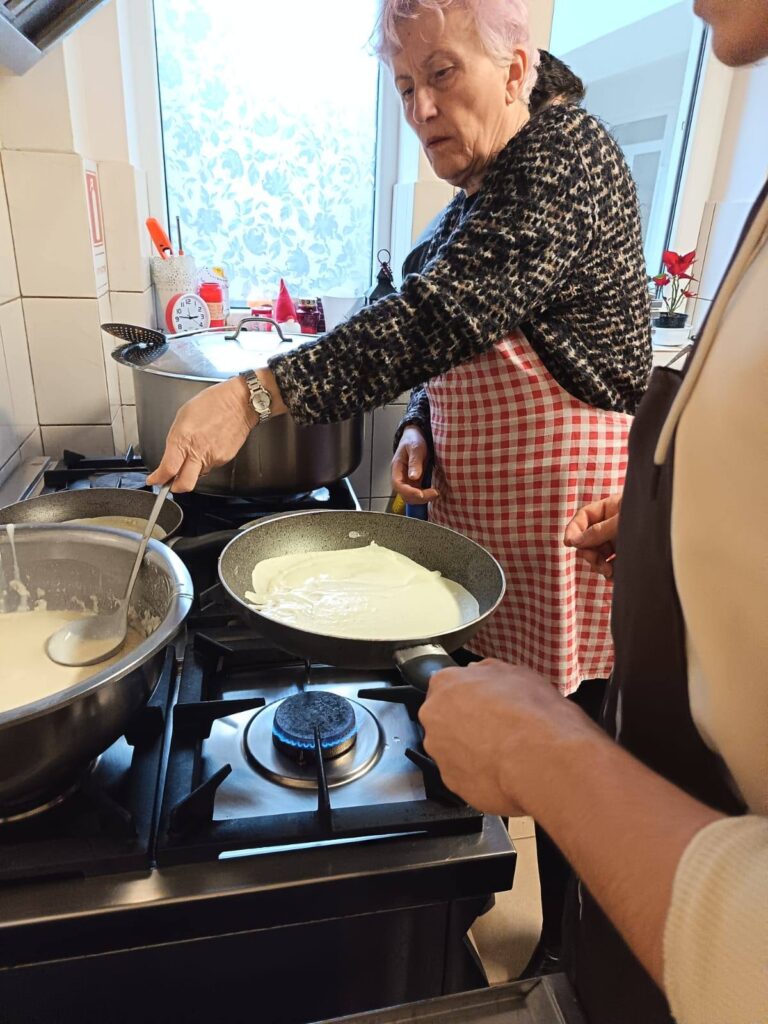 Meniul zilei a constat în cus cus cu tocăniță din piept de pui, iar la final, tinerii au pregătit și clătite, spre încântarea beneficiarilor.