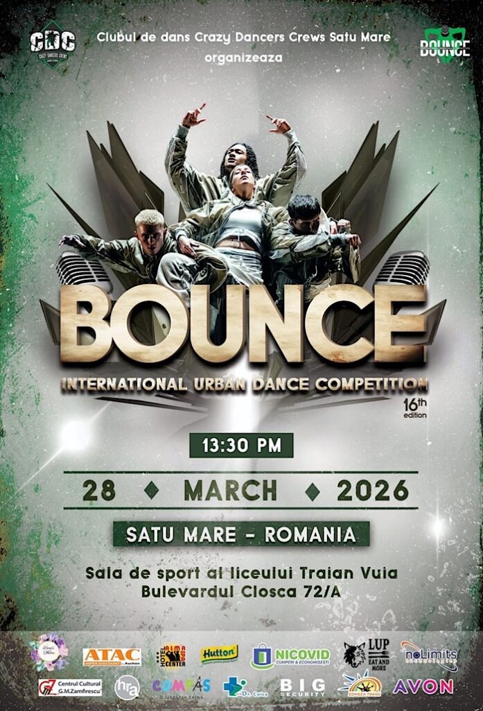 Pasionații de street dance și cultura hip-hop au un motiv serios de entuziasm: sâmbătă, 28 martie 2026, municipiul Satu Mare găzduiește unul dintre cele mai așteptate evenimente de profil din România – Bounce – International Urban Dance Competition.