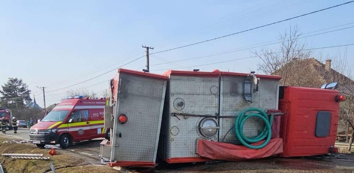 Accident rutier cu mașină de pompieri răsturnată pe șosea, în Maramureș! Pompier rănit!