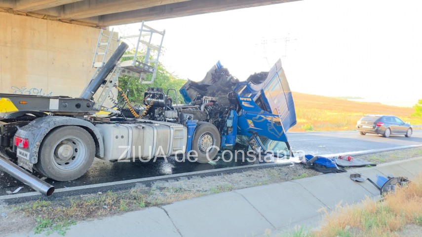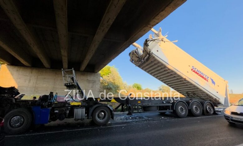 Accident rutier mai puțin obișnuit! Bena unui autocamion s-a deschis în mers și a lovit un cap de pod, șoferul rămânând încarcerat!