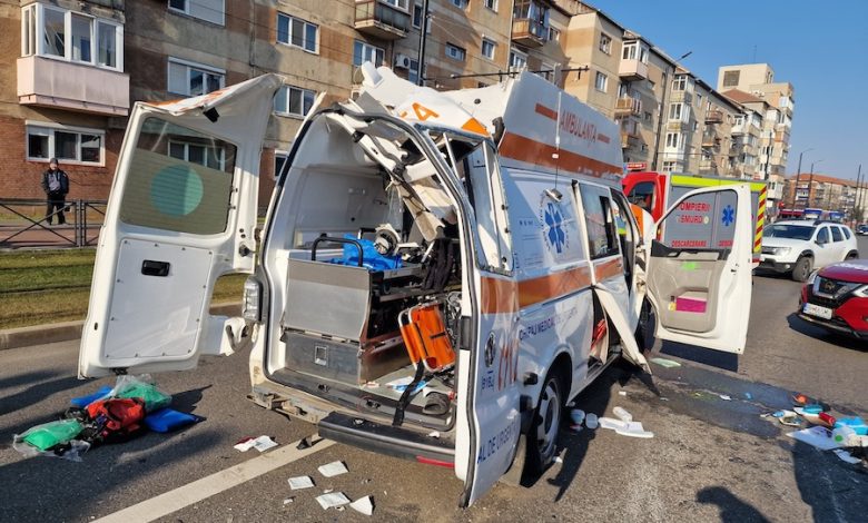 O ambulanță, care transporta un pacient, a fost răsturnată în urma unui accident rutier, în Oradea!
