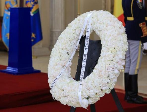 „Odihnește-te în pace! Cu adâncă durere, Nina!”, este mesajul care apare pe panglica de pe coroana funerară, cu sute de trandafiri albi, plasată lângă sicriul fostului lider de stat