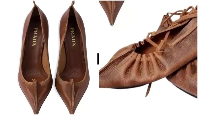 Pantofii, sub brandul Prada – Antiqued leather pumps, se comercializează online cu 1.150 de euro, în comparație cu 150-200 de lei cu cât se vând o pereche de opinci similare, produse la Avrig.