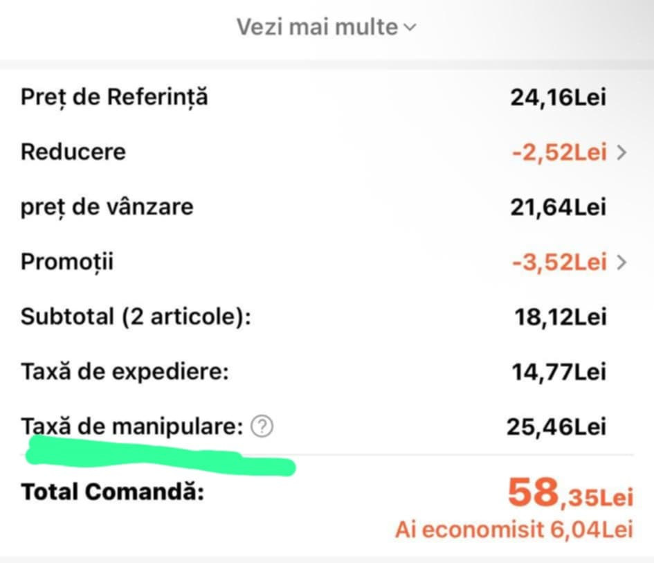 Astfel, așa cum se poate vedea și în imaginea de mai jos, clientul are de plătit o taxă de manipulare de 25,46 de lei, introdusă, ca urmare a legii menționate mai sus.