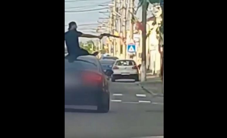 Scene de Vestul Sălbatic în Teleorman! Un individ cocoțat pe mașină, amenința trecătorii cu arma!