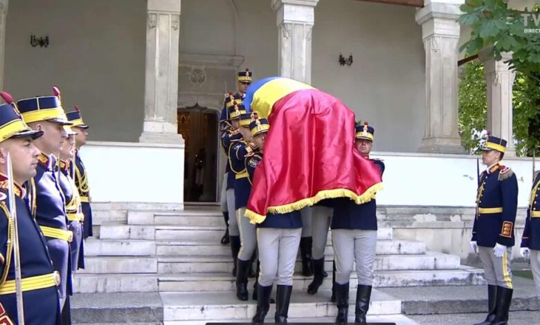 Cortegiul funerar a primit ultimul onor de la garda Cotrocenilor şi a plecat spre cimitirul militar Ghencea III.