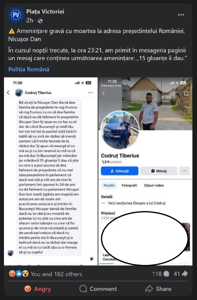 Individul, cu numele de utilizator Codruț T., a transmis amenințările într-un mesaj pe Facebook, lung și incoerent și cu multe greșeli de ortografie, în care spune că-i va „da 15 gloanțe” lui Nicușor Dan, dacă nu renunță la funcție în 24 de ore.. Mesajul a devenit viral pe rețeaua de socializare.