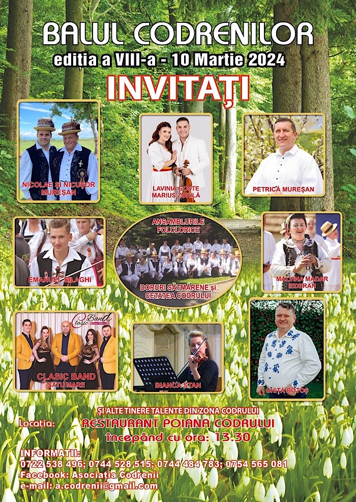 Asociația Codrenii a făcut anunțul mult așteptat de întraga comunitate. Anul acesta, ,,Balul Codrenilor” va avea loc la Restaurantul Poiana Codrului din Satu Mare, în data de 10 Martie 2024, începând cu ora 13:30.
