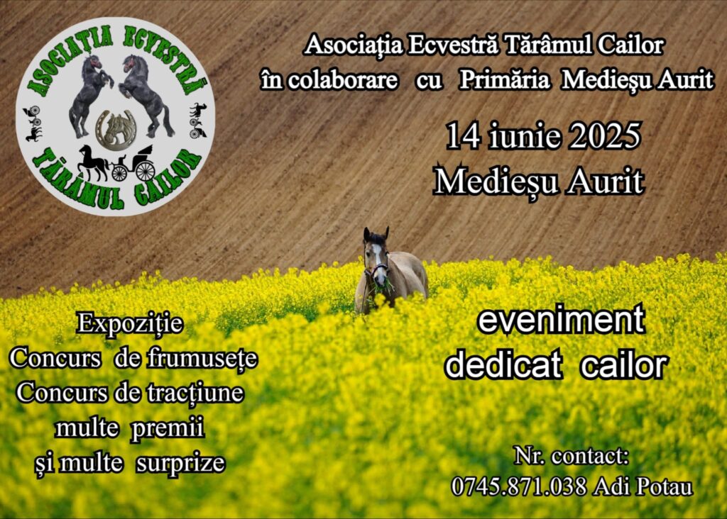 Asociația Ecvestră „Tărâmul Cailor”, în parteneriat cu Primăria Comunei Medieșu Aurit, are plăcerea de a vă invita sâmbătă, 14 iunie 2025, cu începere de la ora 09,00 , la un eveniment de excepție, desfășurat în inima localității Medieșu Aurit, în spatele gării CFR, dedicat în întregime nobilului prieten al omului – calul.