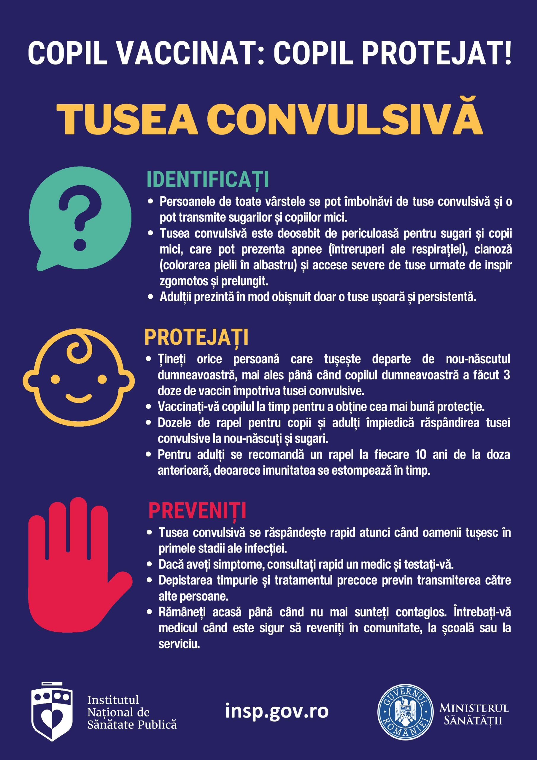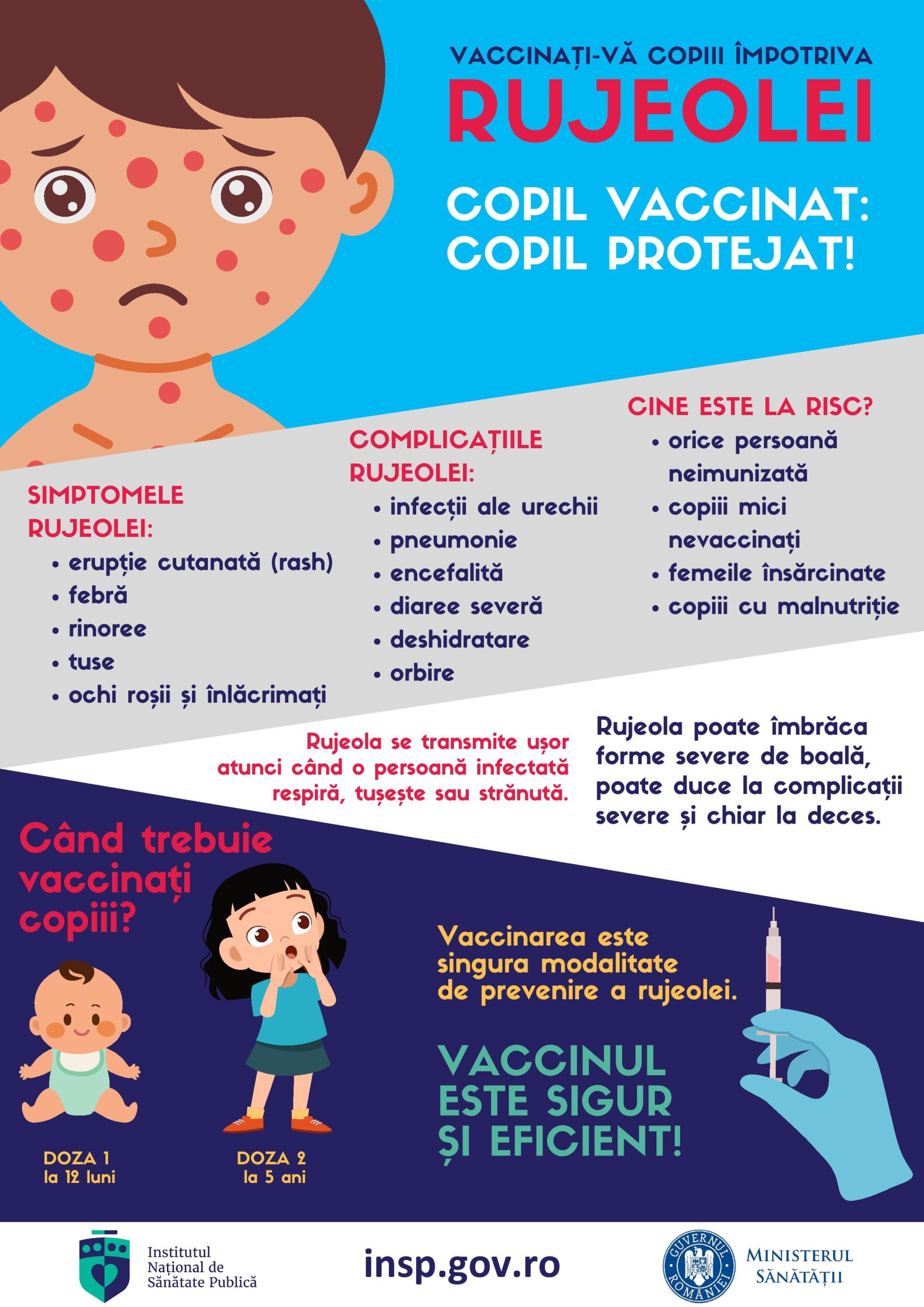 Institutul Național de Sănătate Publică și direcțiile de sănătate publică județene atrag atenția asupra importanței respectării recomandărilor medicale în ceea ce privește vaccinarea copiilor. „Vaccinarea este modalitatea sigură, eficientă și rapidă prin care putem să protejăm copiii împotriva unor boli grave, care pot conduce la decese. Prin vaccinare putem evita episoade de boală ale copiilor, episoade de internare și chiar decesele produse de boli pentru care există metode de prevenire.”