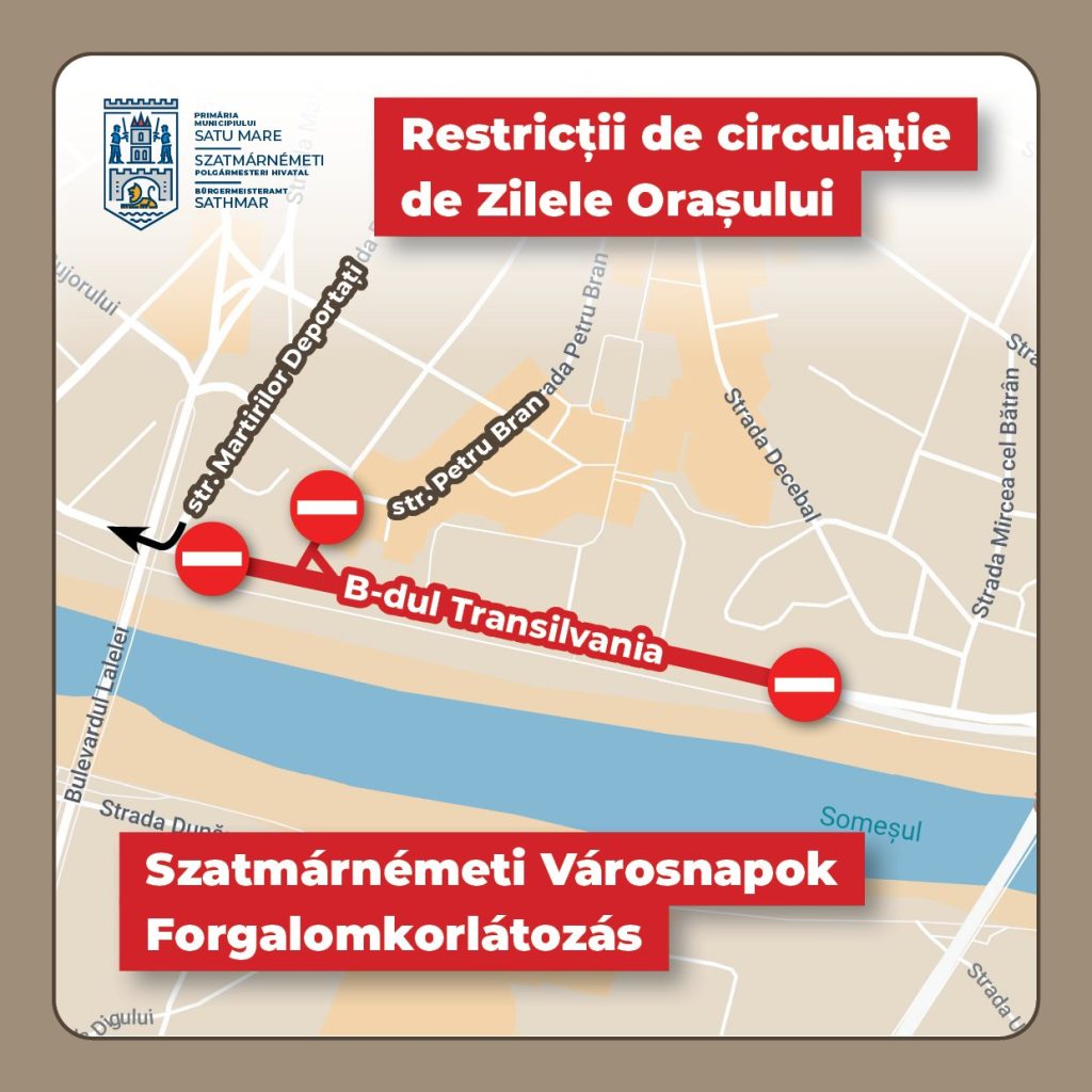 Pentru ca sătmărenii să aibă un final de săptămână cât mai plăcut, participând la evenimentele cuprinse în cea mai mare sărbătoare a comunității noastre – Zilele Orașului Satu Mare, se anunță restricții de circulație începând de joi, 23 mai, ora 20.00, și până luni, 27 mai, ora 05.00, pe Bulevardul Transilvania din Satu Mare.