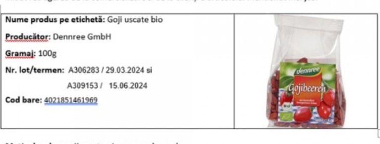 „Goji uscate bio, 100 g, nr. lot / termen A306283/29.03.2024 și A309153/15.06.2024“. Motivul retragerii este contaminarea cu Salmonella.