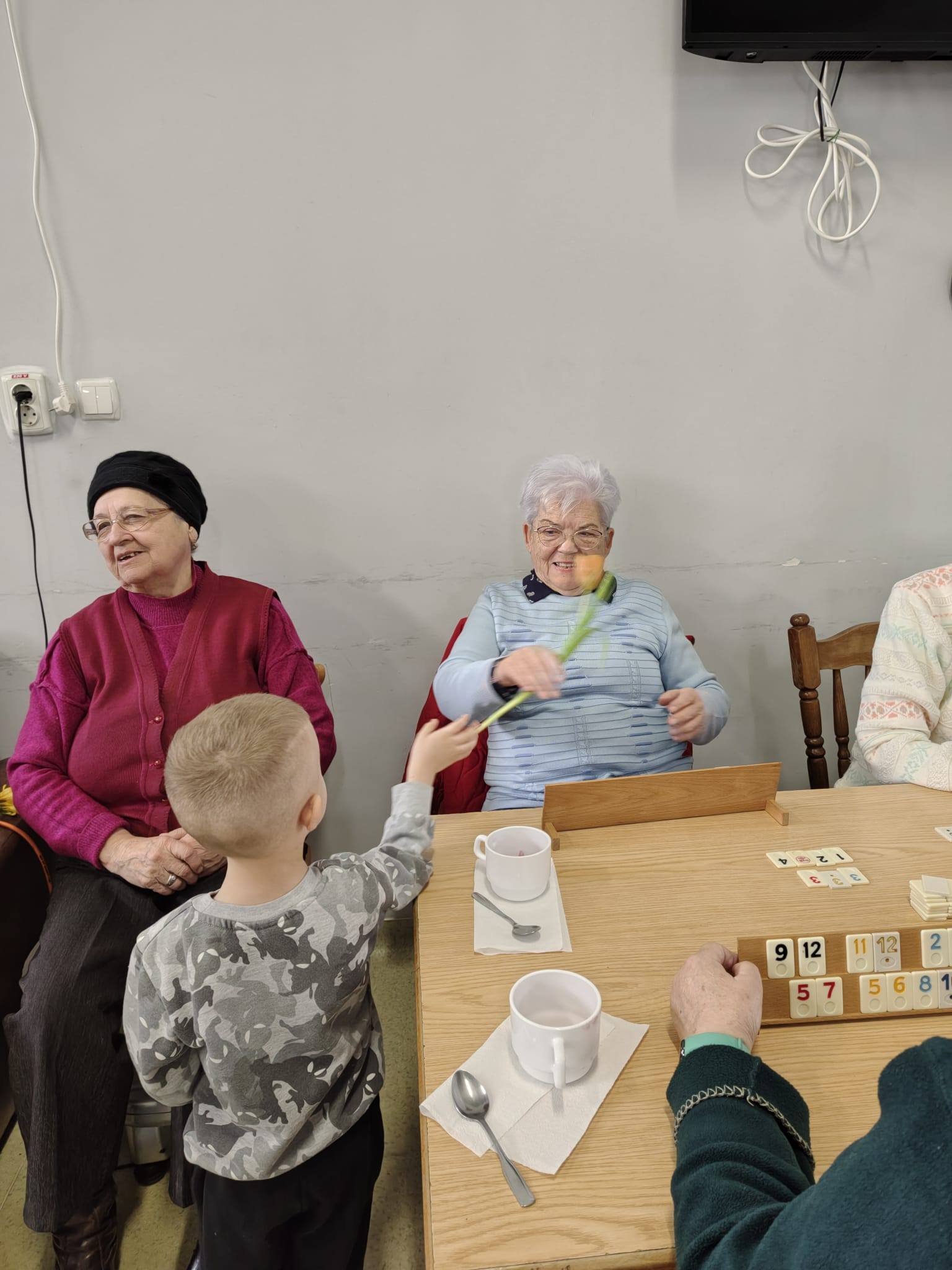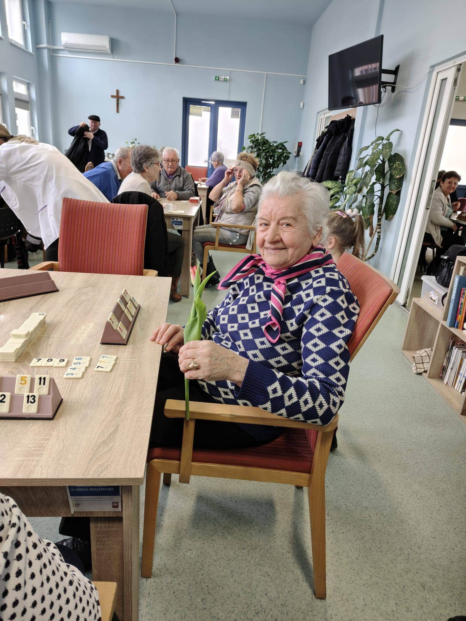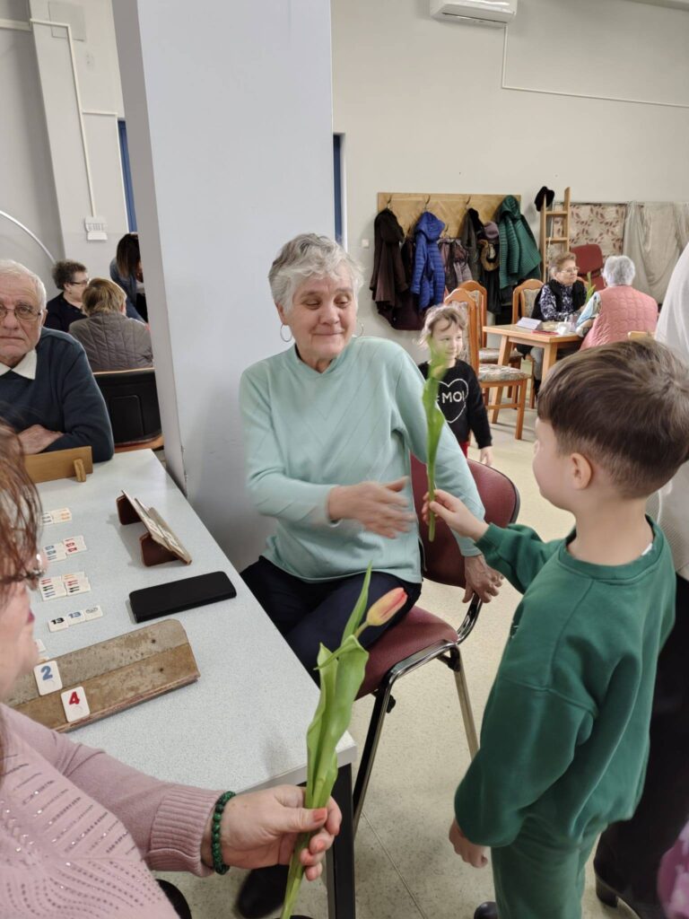 Cei mici au pregătit o surpriză simbolică: câte o lalea, floare ce vestește primăvara și renașterea naturii, dar și bucuria revederii. Momentul a continuat cu o activitate practică, în cadrul căreia copiii și vârstnicii au realizat împreună felicitări de primăvară. Mâinile mici, pline de entuziasm, și mâinile cu experiență au lucrat cot la cot, într-o atmosferă caldă și plină de afecțiune.