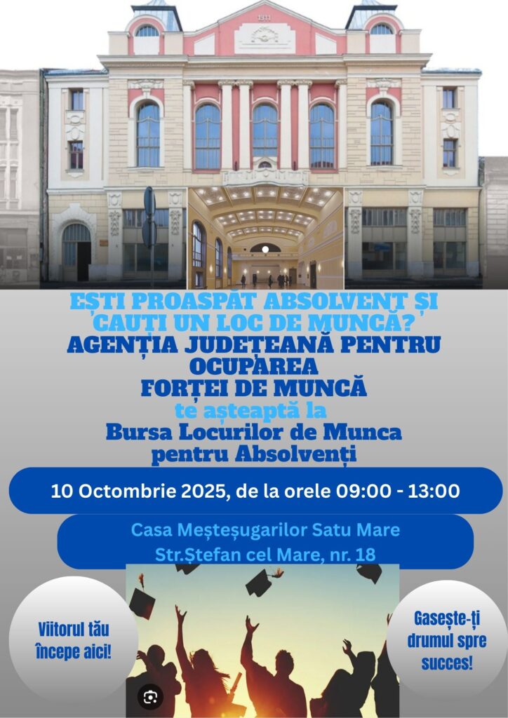 Agenția Județeană pentru Ocuparea Forței de Muncă vă așteaptă cu drag pe dumneavoastra prospăt absolvenți, precum si persoanele in căutarea unui loc de muncă la Bursa Locurilor de Muncă pentru Absolvenți pe 10 octombrie 2025!