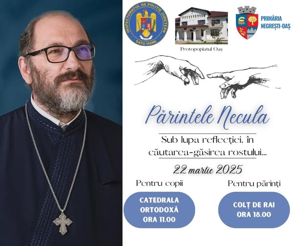 Primăria Negrești Oaș, împreună cu Proptopopiatul Negrești Oaș vă invită sâmbătă 22 martie, ora 18:00, la sala de evenimente ,,Colț de rai”, la conferința SUB LUPA REFLECȚIEI ÎN CĂUTAREA-GĂSIREA ROSTULUI…, susținută de părintele Constantin Necula.![]()