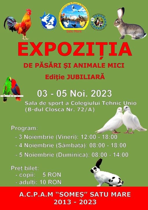 Asociația Crescătorilor de Păsări și Animale Mici Satu Mare organizează, în acest weekend, expoziția anuală a asociației. Evenimentul a debutat astăzi, 3 noiembrie și se va încheia duminică, 5 noiembrie, fiind vorba de o expoziție aniversară: zece ani de la înființarea asociației. În cadrul evenimentului sunt expuși 254 de porumbei, 50 de găini și 144 de iepuri.