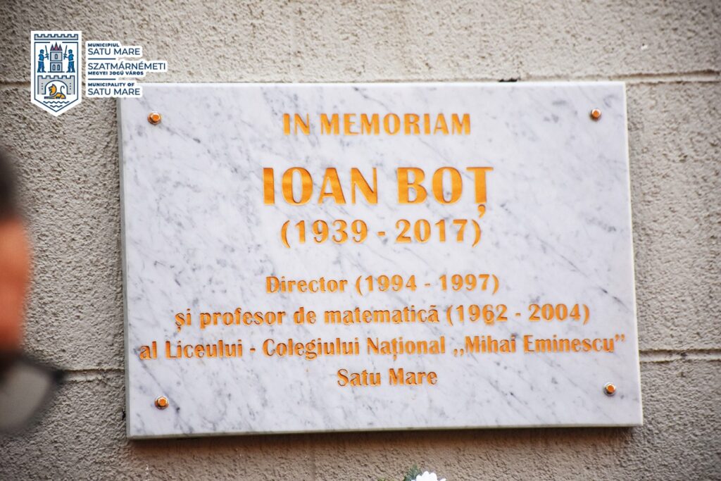 Profesorul Ioan Boț, (19 iun. 1939 – 2 sept. 2017), fost director al Colegiului Național ,,Mihai Eminescu’’, reper emblematic al școlii de matematică sătmărene, a fost omagiat azi prin dezvelirea unei plăci comemorative, pentru o aducere aminte despre unul din corifeii școlii de matematică din Satu Mare. Profesorul Ioan Boț a întruchipat cum nu se poate mai bine performanța în învățământul sătmărean.