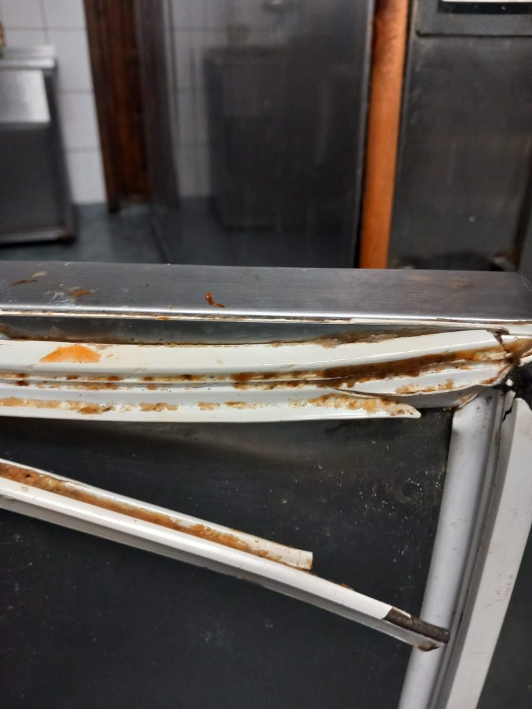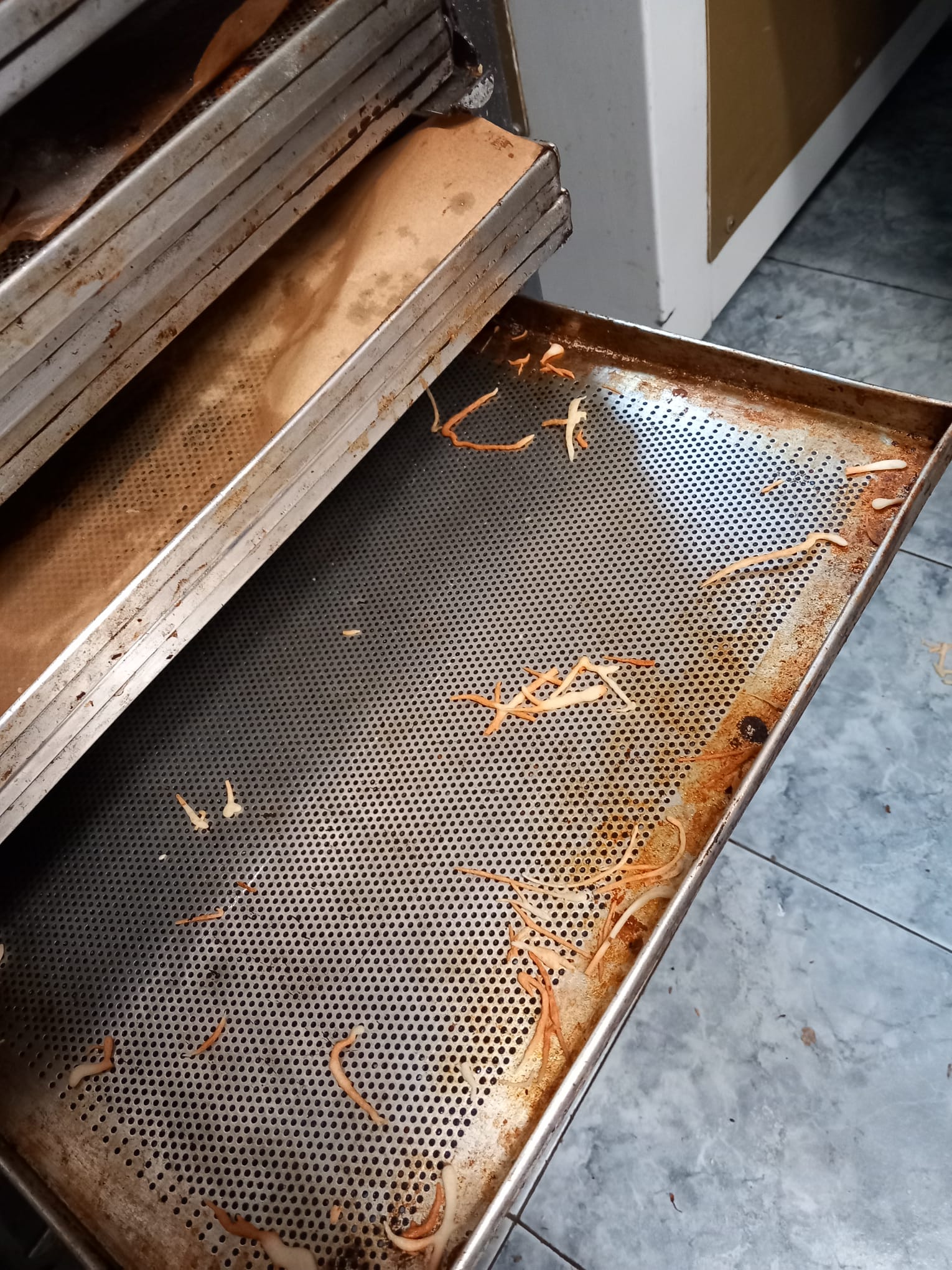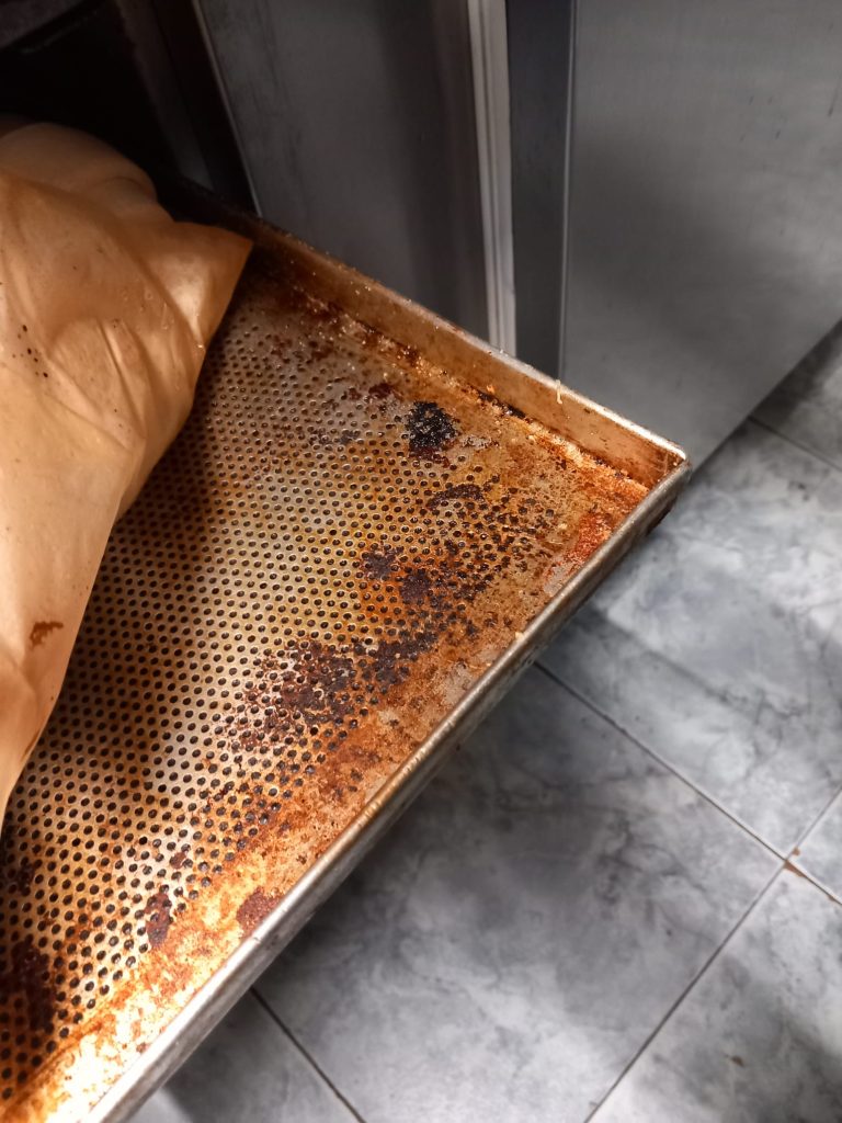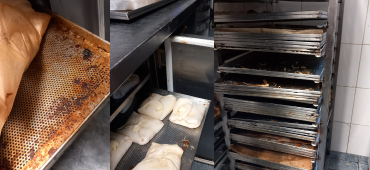 - Tăvi utilizate la coacere și depozitare neigienizate, cu depuneri de grăsime și resturi de produse arse;