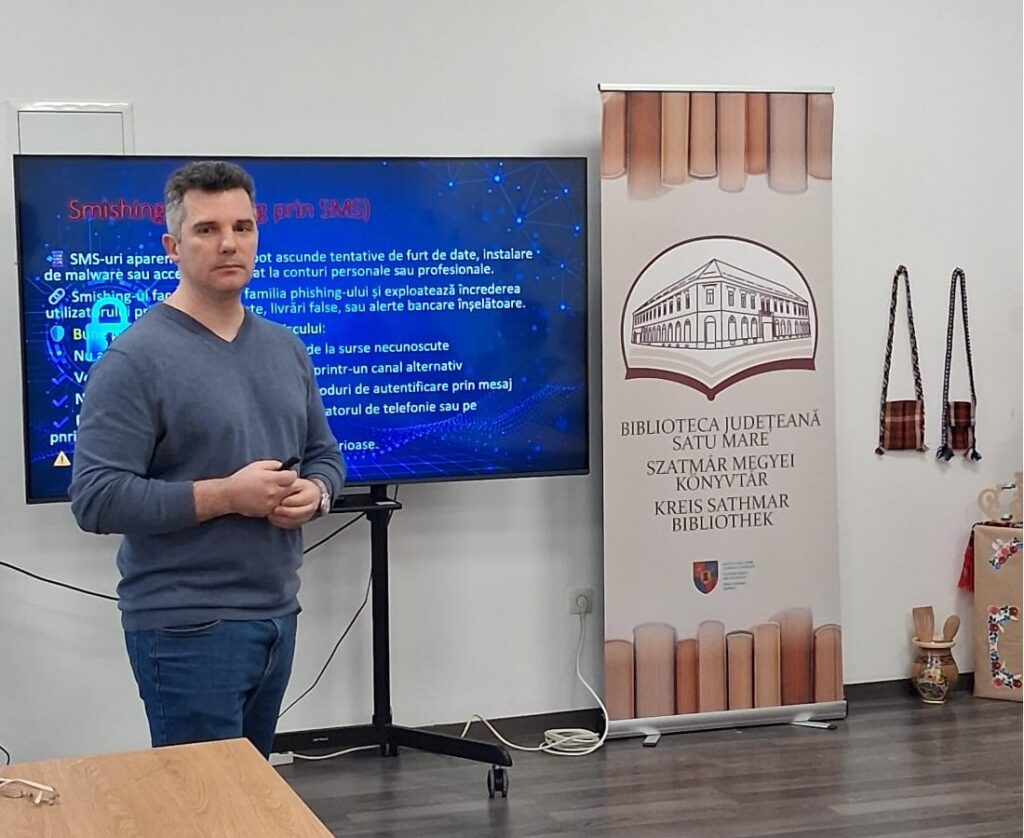 Biblioteca Județeană Satu Mare, în parteneriat cu Inspectoratul de Poliție Județean Satu Mare – Compartimentul Analiza și Prevenirea Criminalității, a organizat astăzi, 17 februarie, activitatea „Protejează-ți datele și fii în siguranță online – Atelier practic de siguranță digitală”, un eveniment dedicat persoanelor adulte interesate să utilizeze internetul în mod informat și responsabil.